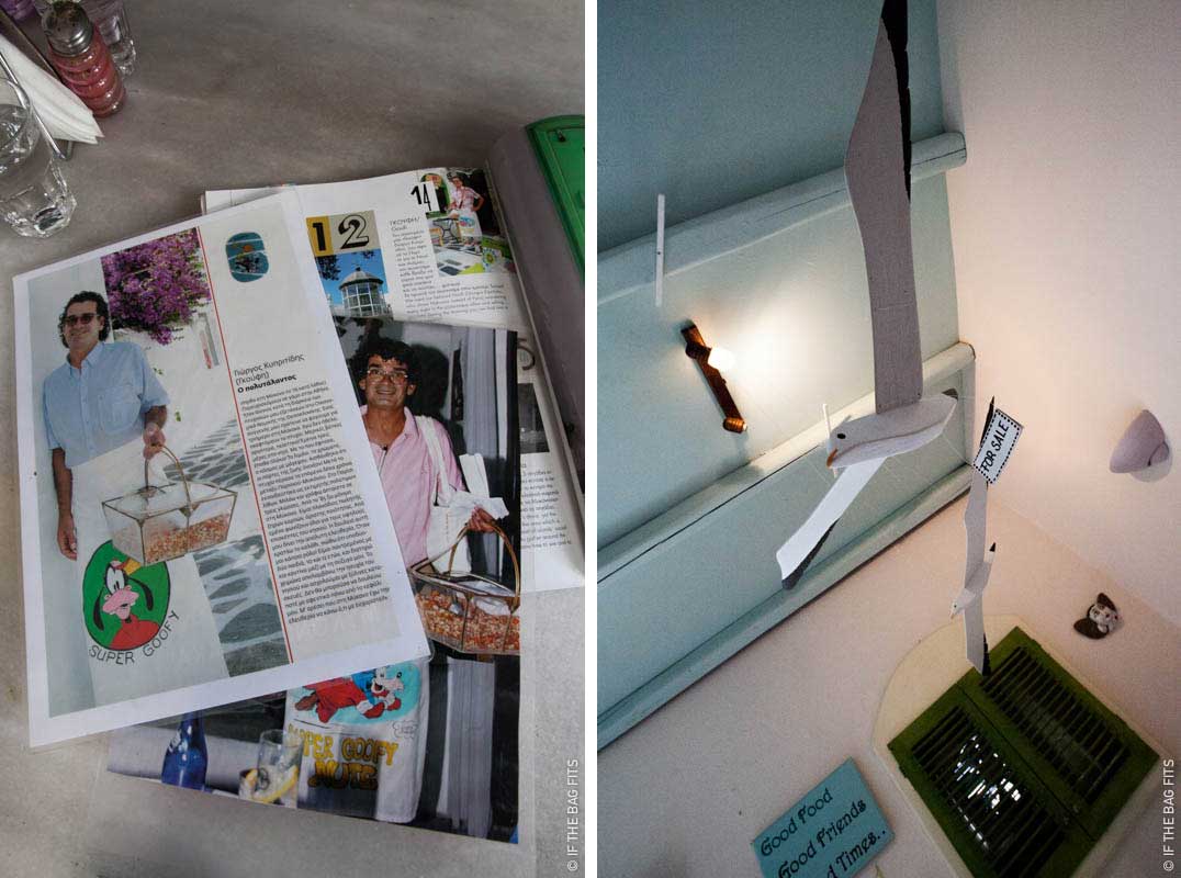 The wooden seagulls that you’ll see hanging from the ceilings of the cafe are actually handmade by Goofy and he evenĀ ffered to customise ours if we wanted another color or size. It’s one of the few souvenirsĀ from our visit to Mykonos we have hung onto because it was so reflective of our experience on the island and something that you don’t find everywhere either.Ā There were people popping intoĀ the cafe as we had our breakfast just to ask about them!